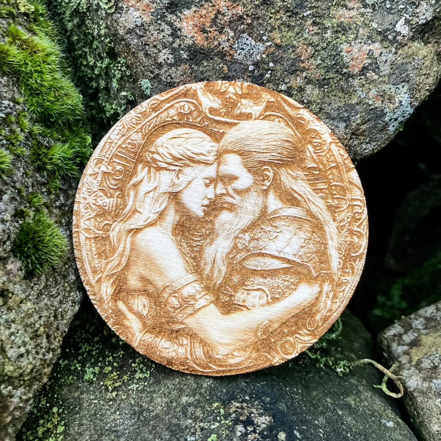 Viking Couple Engraved Wooden Fridge Magnet or Coaster.