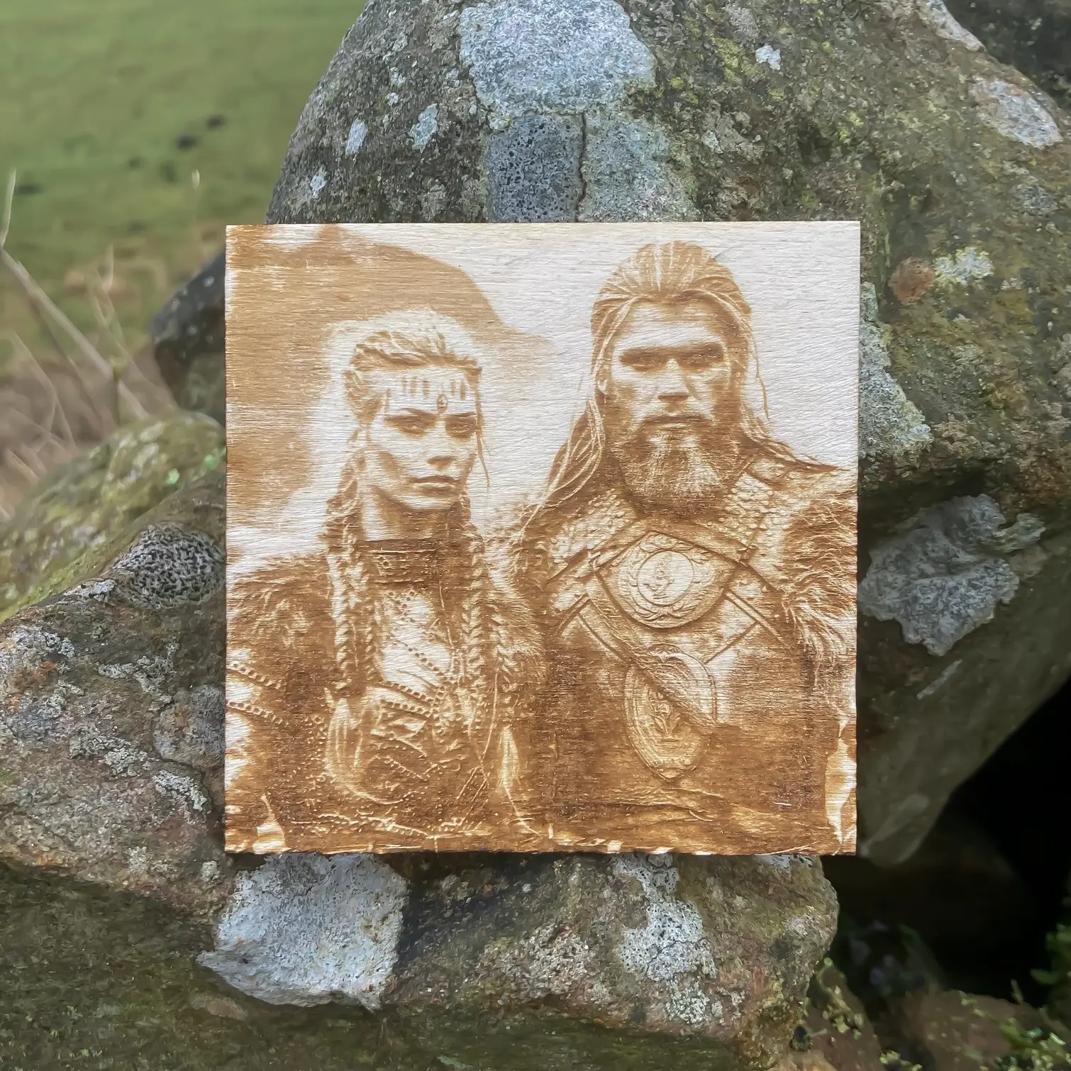 Viking Couple Engraved Wooden Fridge Magnet or Coaster.